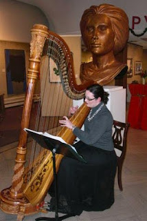 So far this year, I have played for two law office open house events, one chamber of commerce party, and two mini-concerts at a shopping mall.  This picture is from an open house held at the Midwest Museum of Art in Elkhart, Indiana.  I’ve been the harpist for this even for the past four years, and love sitting in front of the giant head!