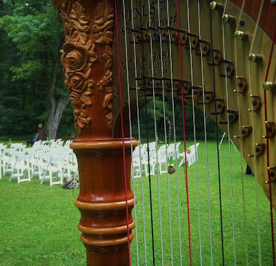 Of course, since the harp is made of wood, it cannot get wet.  They lucked out that there is an artists’ studio building right behind the ceremony site.  I was able to set the harp up inside, and put my amplifier in the door so the music would still reach the guests.  Of course, as soon as I got my harp out there, it began to rain!