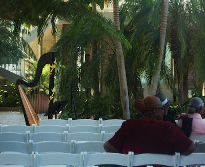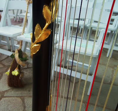 When the wedding party was lined up and ready to begin, I played “Canon in D.”  Quite the change from the drummers – everyone knew the wedding was starting!  The bride incorporated many items from her parents’ wedding ceremony into her own, including her processional song, “Misty.”  The bride’s mother served as the Matron of Honor, and the groom’s father was his son’s Best Man.  Dara looked stunning in a gold lace dress.  The black and gold colors of my Laurel Leaf harp fit in perfectly with their ceremony!