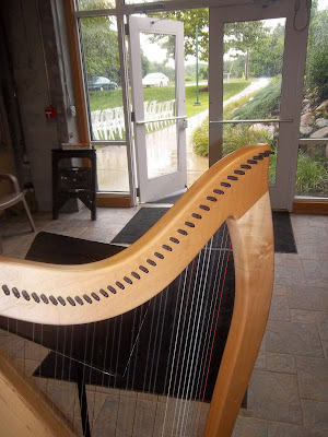 The wedding was supposed to start at 4:00, and that’s exactly when the rain stopped. The bride’s family and friends rushed to take down the canopy and dry off the chairs. I set up in the lobby and played prelude music from there for awhile. When it was time to get everyone moved outside, I was able to get the harp out there quickly (thank goodness for my ultra-portable BlevinSong harp!).