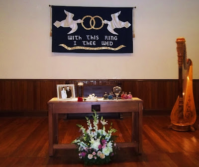 As guests gathered in the chapel, the prelude consisted of mostly classical songs plus “Goin’ to the Chapel” as the final song before the processional.  The families of the bride and groom entered to “Canon in D” and as the aisle runner was pulled by the bride’s sons, I switched to “Trumpet Tune,” the piece that continued through the entrance of the groom and the officiant.  Sandy opted for the traditional “Bridal Chorus” for her processional.