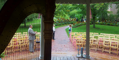 As I was driving to Deep River County Park, I received a slightly panicked phone call from my bride for the day, Christina. She had planned a beautiful outdoor wedding ceremony at the park’s gazebo, and it was in danger of being ruined by the remnants of Hurricane Isaac coming through Indiana. Because harps are made of wood ~ and extremely expensive to repair or replace ~ it’s crucial that it not get wet! Fortunately, the gazebo has a (mostly) solid roof, and provides enough cover for the harp. The only change we had to make to have the wedding go off as planned was to set the harp up inside the gazebo, rather than off to the side. Not bad!