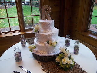 Carrie and Steve are from the Chicago area, but chose to get married in Glen Arbor, Michigan, at the Homestead Resort. Northern Michigan is beautiful in the fall, and makes a perfect location for a close-to-home destination wedding. The venue was beautifully decorated, with lanterns as part of the centerpieces, and a rustic styled wedding cake on a bark-covered cake stand.