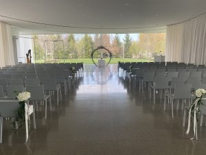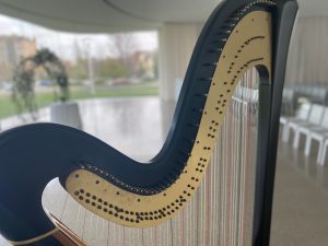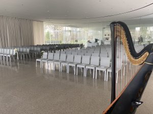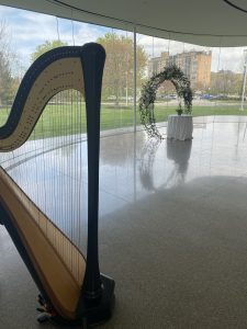 Wedding Musician Toledo HarpistThis spring has blessed my April couples with beautiful weather!  Although we were indoors at the Toledo Museum of Art, the view was still stunning from the GlasSalon.  The curved, floor-to-ceiling windows brought the outdoors in!